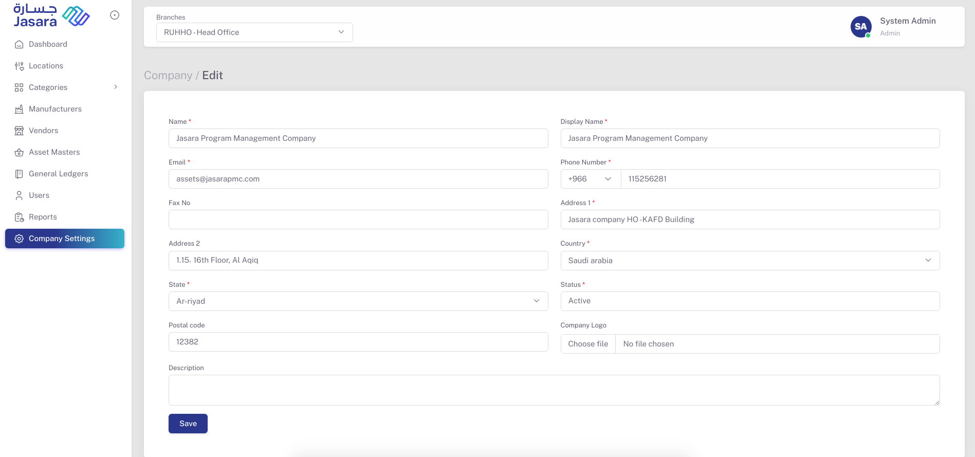The Company Settings module allows the system admin to set and update primary information related to the company: