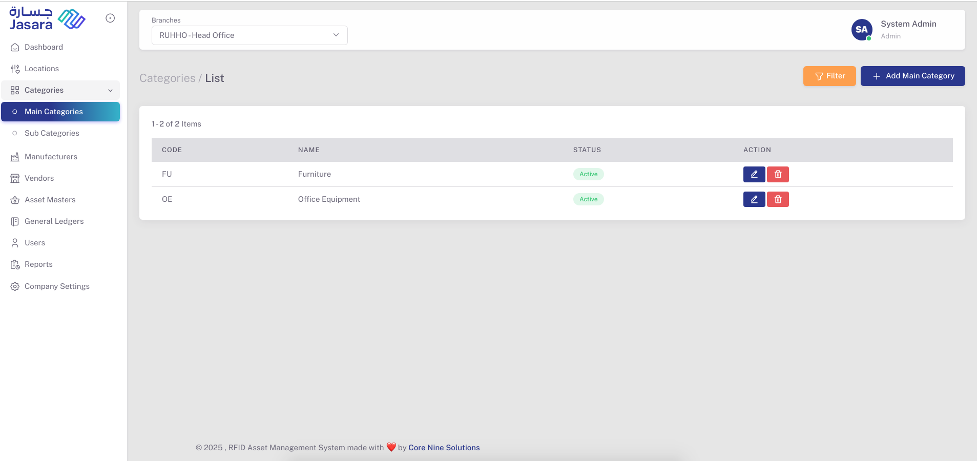 - Main Category List View: Quickly view all categories with Code, Name, Status, and Action buttons (Edit/Delete).
