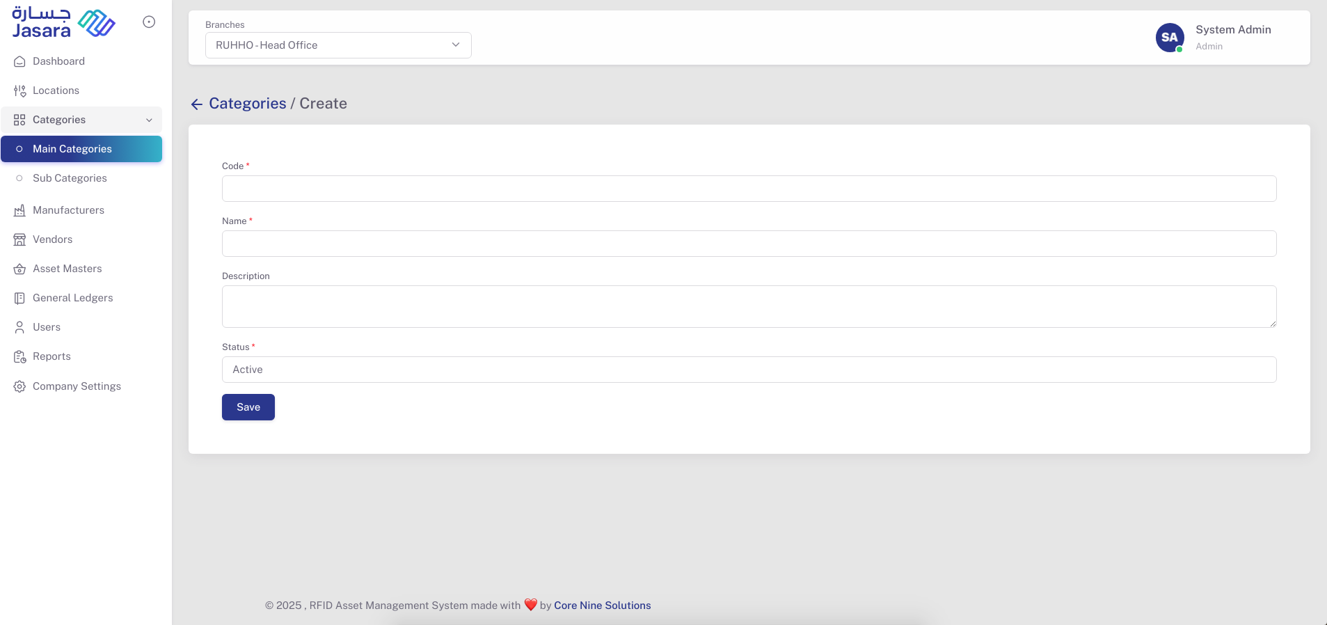 The Manage Categories section allows administrators to define and organize all asset classifications within the system. By creating a two-level structureβMain Categories and Sub Categoriesβusers can ensure assets are grouped logically for better tracking, easier reporting, and faster identification across departments. This modular classification supports scalability and consistent data entry across the organization.