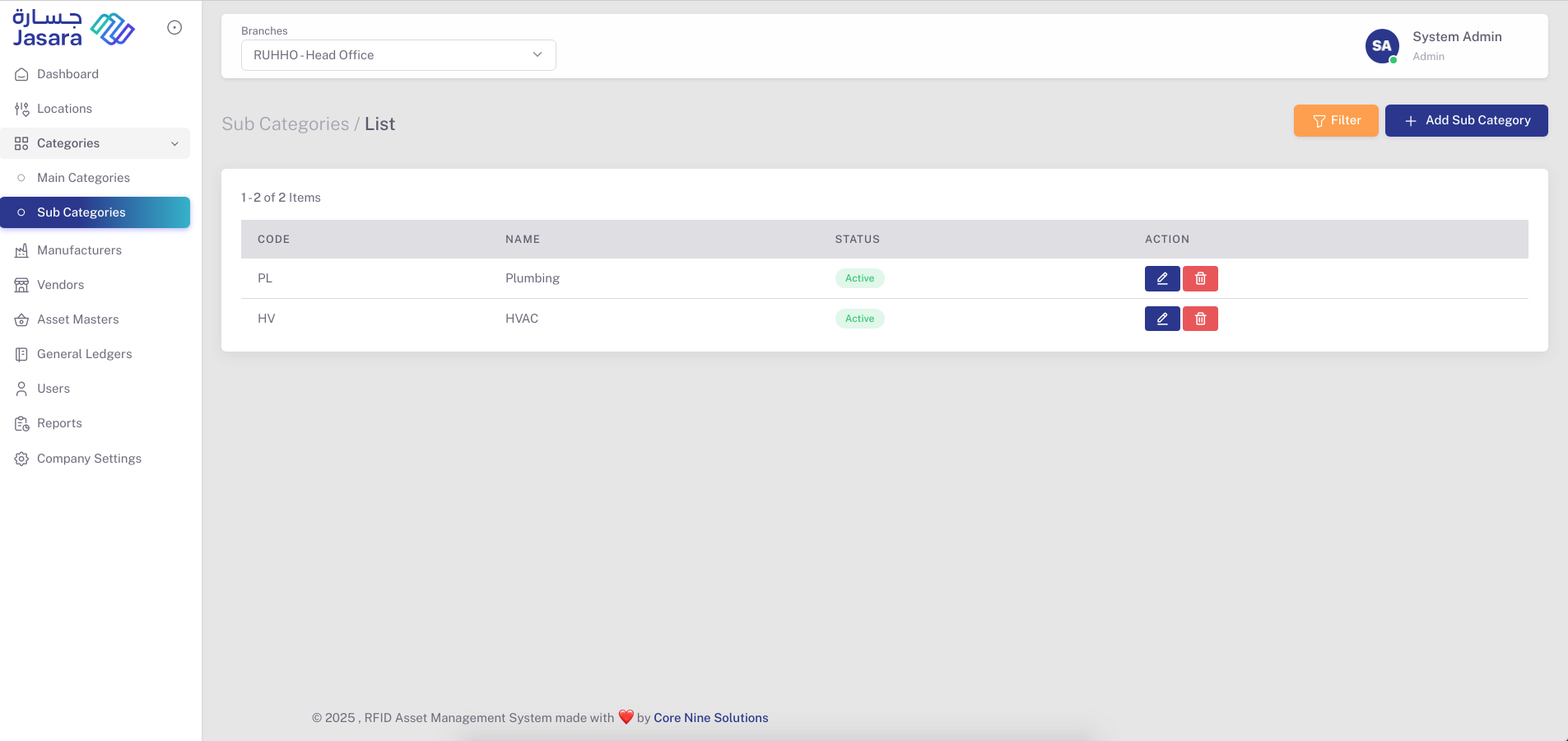 - Sub Category List View: Displays Code, Name, Status, and management actions.