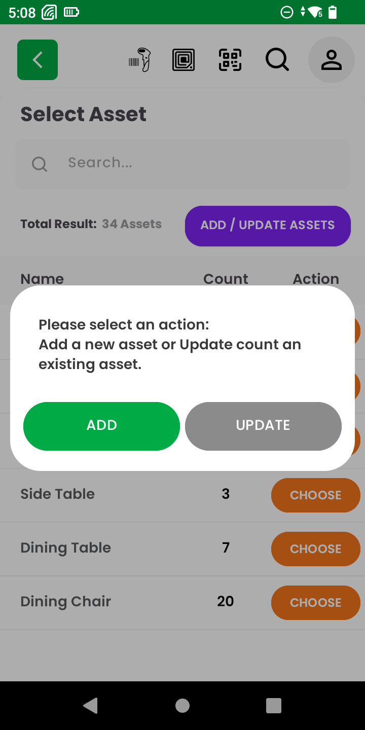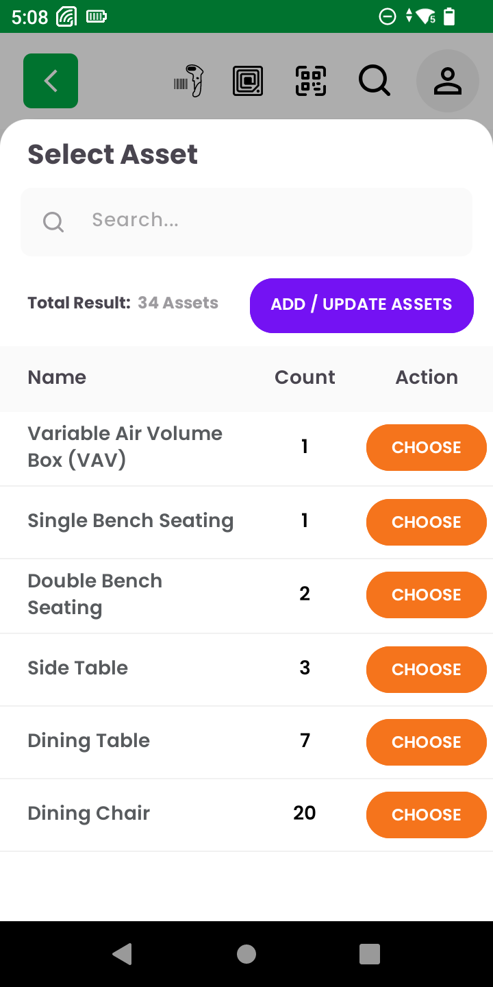 Once an unassigned RFID tag has been selected for action, the app provides a list of existing assets under the selected location. This enables the user to correctly associate the scanned tag with the corresponding asset.