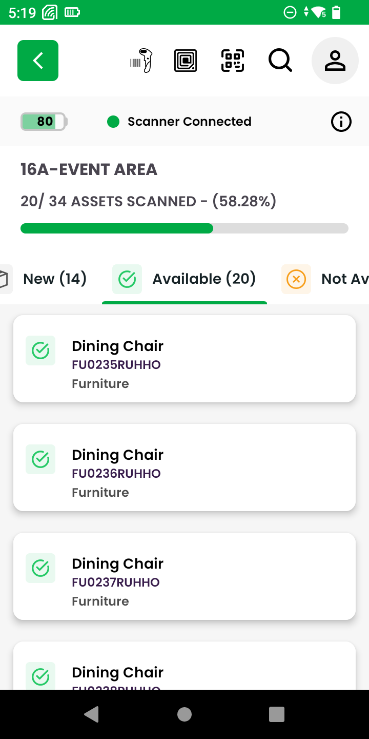 Once a portion of tags are scanned and assignments are complete, users can review the scanned asset list by status:
