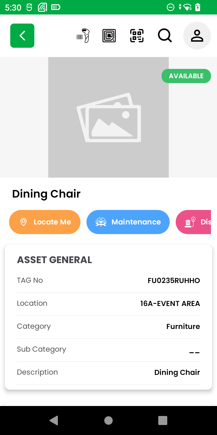 - Action buttons like Locate Me, Maintenance, Dispose, and Remove RFID are available based on the assetβs current state.