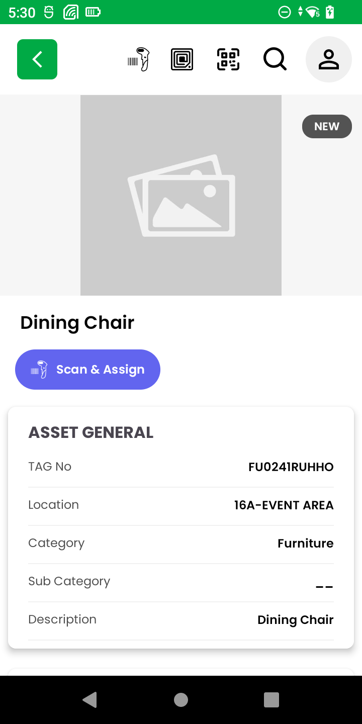 - Each asset card provides asset name, tag number, category, and sub-category.